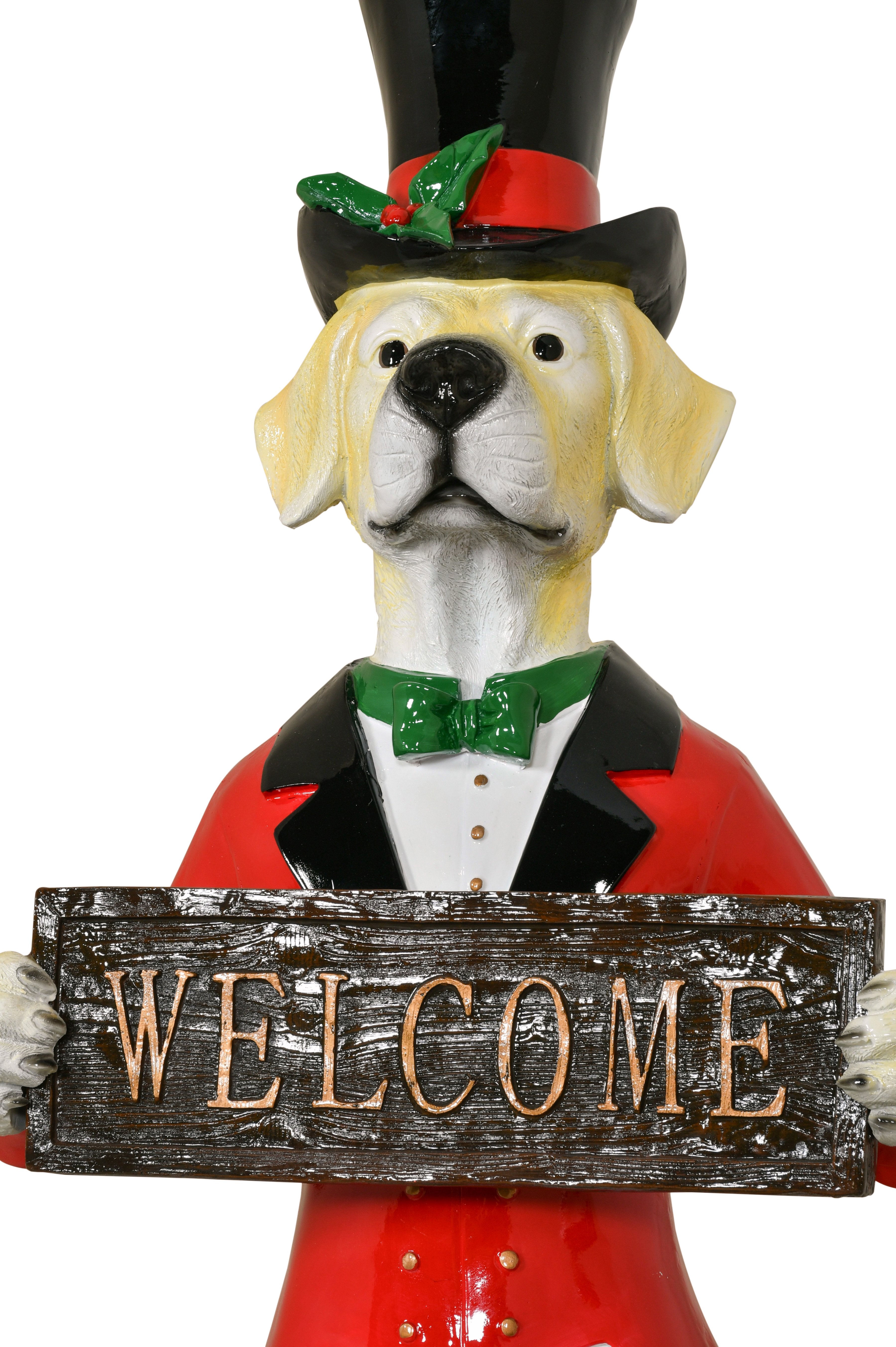 Imagine being greeted by this distinguished canine figure standing at an impressive 56 inches tall. Clad in a striking red tuxedo, crisp white trousers, and polished black boots, this stylish dog exudes a charm that is both whimsical and elegant. Topping off the look with a classic top hat, this delightful character holds a "Welcome" sign, inviting guests to your space with a touch of playful sophistication. This piece captures a blend of fun and formality, making it a perfect addition to liven up an entryway, a quirky boutique, or a special corner of your home that calls for a cheerful welcome.