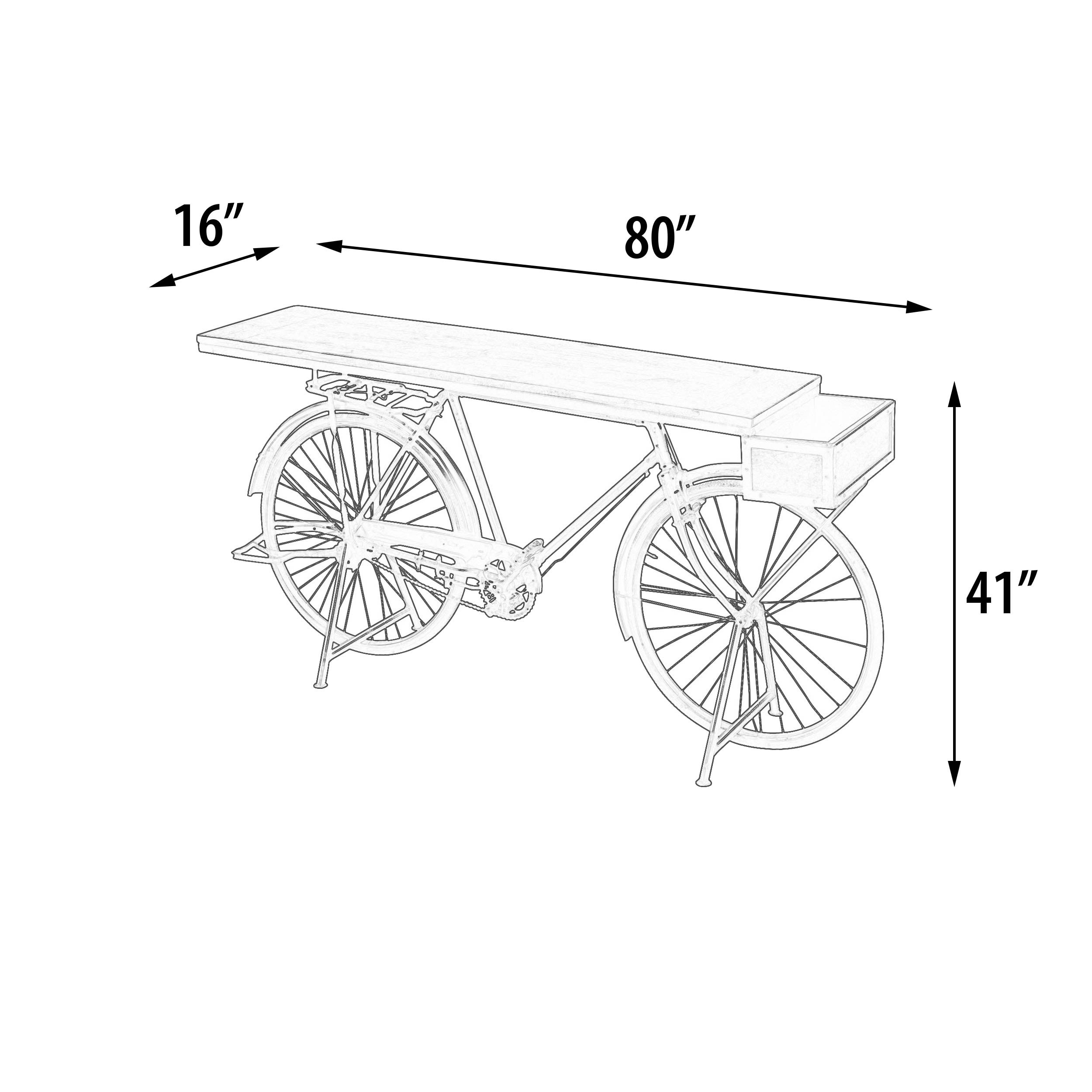 Mountain Blacksmith Authentic Bicycle Console Bar Counter Vintage 80 Inches. A Unique Find! An Authentic Vintage Bicycle that has been re-purposed for a Bar, Counter or Console use. The Bicycle Console Bar is mounted on an Iron stand for secure placement. This design works well for any Bicycle Enthusiast and styled for American Farmhouse, Coastal, Urban, Industrial and/or Rustic Interiors. Authentically Hand Created by our skilled Blacksmiths using Old re-purposed Bicycles. These bikes have lots of History and Stories to Tell after being salvaged by our Pickers from the busy day to day traffic, that they each were a part of, from the busy streets of Rajasthan India. Original and Imported from India. Constructed from steel, iron, rubber and hardwoods. Like these unique type hand made items from the Mountain Blacksmith Collection of AFD Home then check out all the cool options for your fun room or business. No Assembly Required, Enjoy!